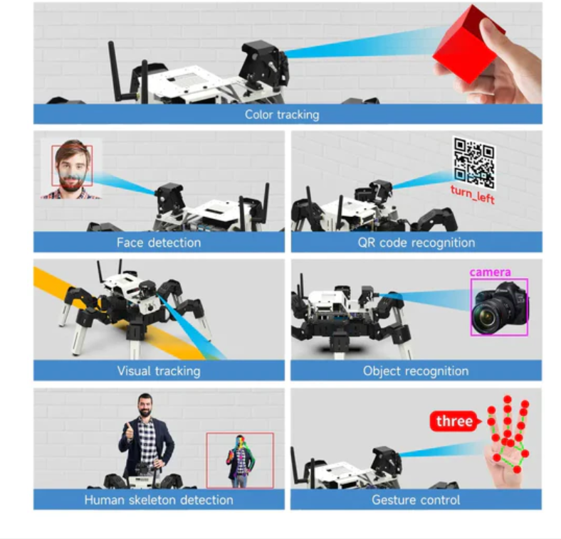 Muto는 데스크탑급 생체모방 육족 로봇으로, 기체는 알루미늄 합금 소재로 만들어졌습니다. 18개의 35KG 금속 서보와 정교한 구조 설계로 놀라운 유연성과 다양성으로 다양한 모의 동작을 수행할 수 있습니다. Raspberry Pi나 Jetson Nano를 주 제어기로 사용하고 Python3로 프로그래밍하여 Muto는 색상 인식, 추적, 얼굴 추적, QR 코드 인식, 시각적 선 추적 등 다양한 기능을 수행할 수 있습니다. 사용자는 모바일 앱, 무선 제어기 및 컴퓨터 웹 페이지 버튼을 통해 제어할 수 있으며, 카메라로 촬영한 비디오를 모바일 기기에 실시간으로 전송할 수 있습니다. Muto 로봇은 기술, 공학 및 프로그래밍을 탐험하는 데 이상적인 파트너입니다.