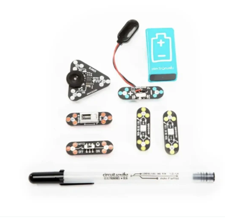 Circuit Scribe Basic Kit은 풀사이즈 펜, 광 출력 등이 포함된 초보자용 키트입니다! 전도도와 같은 기본 회로 개념을 살펴보고, 플래셔 회로 블록과 손으로 그린 순간 스위치를 사용하여 두 개의 플래싱 회로를 만들어 보세요.