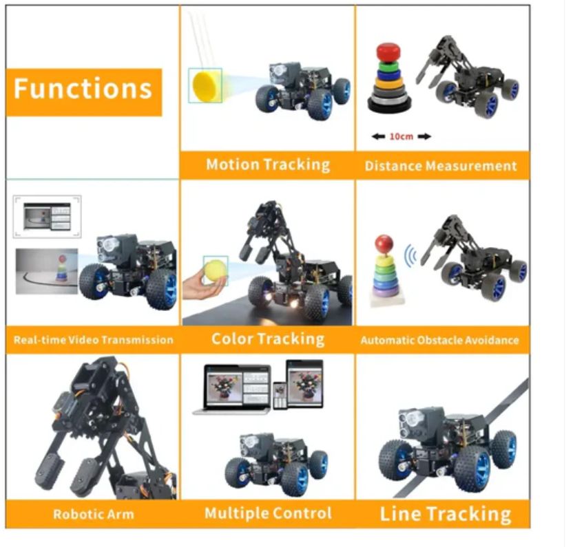 다양한 기능: 물체 운동 추종, 추적, 실시간 영상 전송, 초음파 장애물 회피 등.여러 가지 기능을 결합하면, 당신은 당신의 친구와 멋진 레이싱 쇼와 같은 다양한 재미있는 게임을 할 수 있습니다.
