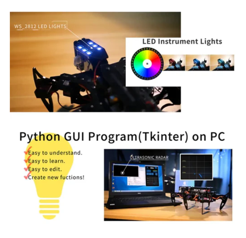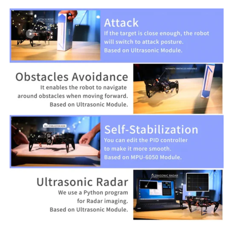 Adeept 육족 거미 로봇 키트(Pixie 포함)는 훌륭한 오픈 소스 육족 거미 로봇으로, 어떤 사람이든 자신만의 걷는 로봇을 만들 수 있습니다. 로봇에 대한 지식이 전혀 없어도 됩니다. 초보자와 고급 로봇 애호가들이 흥미로운 로봇 세계에 입문할 수 있도록 돕기 위해 설계되었습니다.