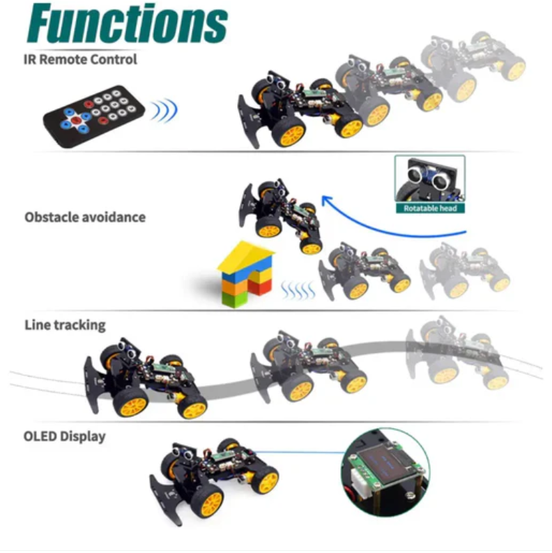 다양한 제어 방식: 적외선 원격 조종, 장애물 회피, 선로 추적 등.지능차는 서보전기로 방향을 제어하여 실제 자동차의 기계 구조에 더욱 가깝다.ESP8266 Wi-Fi 모듈이 장착된 이 키트는 APP를 통해 이 스마트 카를 제어할 수 있도록 프로그래밍할 수 있습니다.