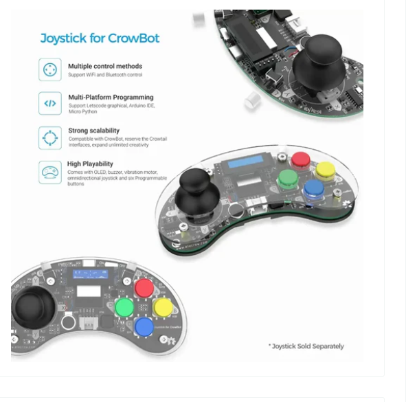 • CrowBot BOLT - 오픈 소스 프로그래밍 가능 스마트 로봇 자동차 STEAM 로봇 키트(조이스틱 핸들 포함)는 ESP32 칩으로 구동되는 혁신적인 스마트 프로그래밍 가능 차량입니다. 이 장치에는 광 센서, 초음파 센서, 선 추적 센서 등 다양한 센서가 장착되어 있습니다. 또한 Wi-Fi와 블루투스 기능이 있어 Letscode, Micropython, Arduino 등 다양한 프로그래밍 환경에서 활용할 수 있는 다재다능한 도구입니다.