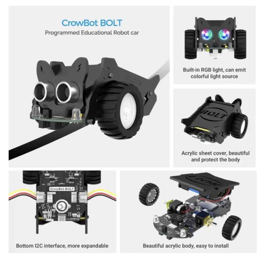 CrowBot BOLT는 빛 추적, 라인 추적, 장애물 회피, 원격 제어, 조명 쇼 등 다양한 기능을 빠르게 수행할 수 있습니다. BOLT는 초보자를 위해 설계된 STEAM 교육용 로봇으로, 로봇 프로그래밍을 재미있고 쉽게 배우고 가르칠 수 있도록 만들어졌습니다.