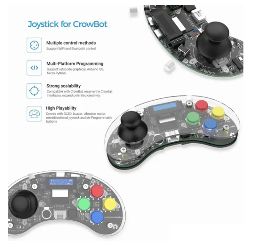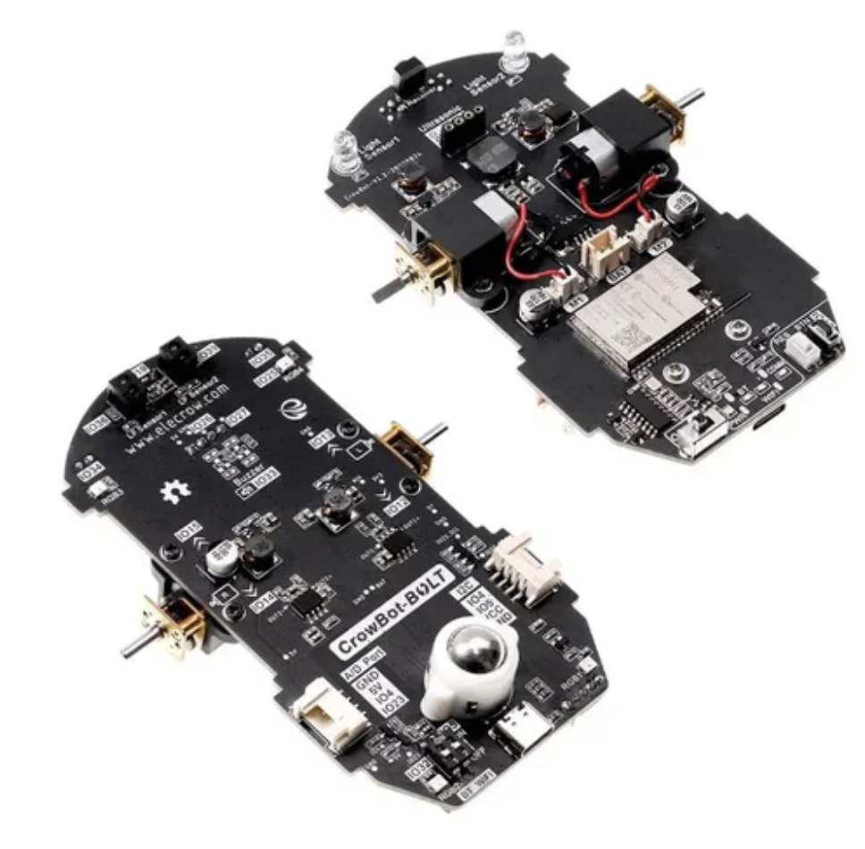 CrowBot BOLT - 조이스틱이 장착된 오픈 소스 프로그래밍 가능 스마트 로봇 자동차는 ESP32 칩으로 구동되는 혁신적인 오픈 소스 프로그래밍 가능 스마트 자동차입니다. 광 센서, 초음파 센서, 라인 추적 센서 등 다양한 센서를 탑재하고 있고 Wifi, Bluetooth 기능도 갖추고 있어 Letscode, Micropython, Arduino 등 다양한 프로그래밍 환경과 호환되는 다재다능한 도구입니다.