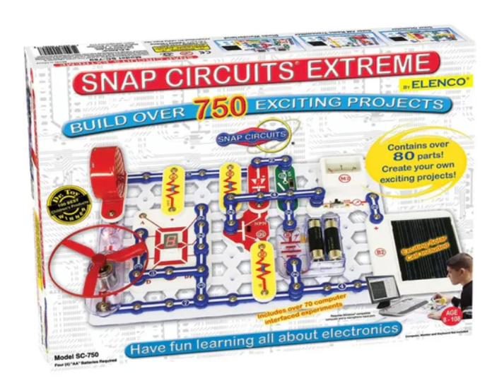 • Elenco Snap Circuits Extreme 750-in-1 키트에는 Snap Circuits Pro 500-in-1 실험 키트의 모든 내용이 포함되어 있으며, 추가로 태양 에너지, 전자기학, 진동 스위치 실험, 70가지의 컴퓨터 인터페이스 실험이 포함되어 있습니다.