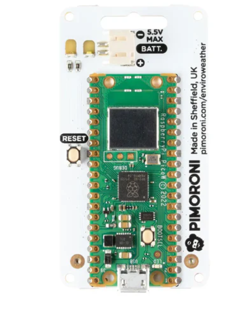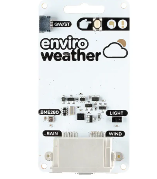 Enviro Weather Pico Board - 날씨 모니터링 장치는 날씨 센서를 쉽게 연결할 수 있는 무선 기후 및 환경 모니터링 시스템입니다. 온도, 습도, 압력, 밝기를 측정할 수 있는 센서가 장착되어 있습니다.