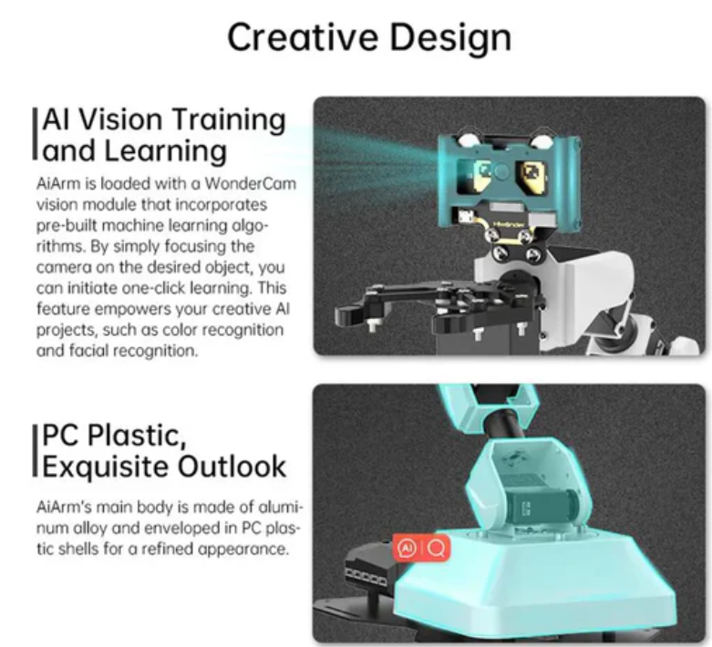AiArm은 WonderCam 비주얼 모듈을 탑재해 1인칭 시야각으로 대상 물체를 감지하고 위치시킬 수 있으며 색상 분류, 쓰레기 분류, 얼굴 인식, 표적 추적 등 다양한 인공지능 애플리케이션을 지원한다.