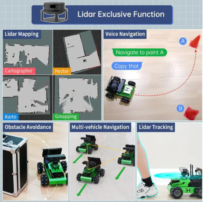 JetAuto는 레이저 레이더를 탑재하여 경로 계획, 지정 항법, 항법 장애물 회피, 다양한 알고리즘 설계도를 지원하여 레이더 수비, 레이더 추적 기능을 실현한다.