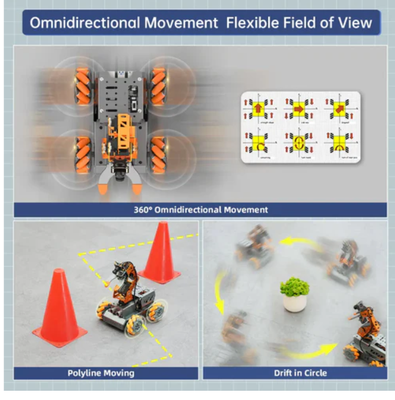 MasterPi는 360 ° 회전이 가능한 4개의 만방향 맥넘 휠을 장착하고 있으며, 다양한 모션 모드 (전진, 수평, 사행, 회전) 와 우수한 성능으로 다양한 복잡한 코스에 과감하게 도전할 수 있다.