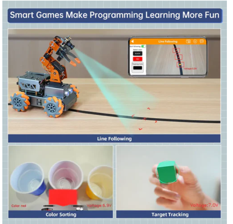 MasterPi는 OpenCV를 이미지 처리 라이브러리로 사용하여 FPV를 이용하여 대상 블록을 식별 위치시킴으로써 색상 분류, 색상 인식, 회선 추적 등 AI 게임을 구현한다.