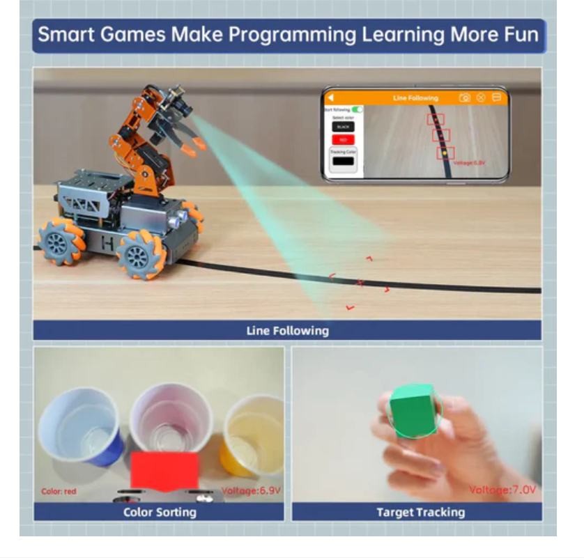 로봇 팔은 풍부한 자습서와 오픈 소스 파이톤 코드를 가지고 있으며 색상 인식, 픽업 및 분류 등의 작업을 수행 할 수 있습니다.