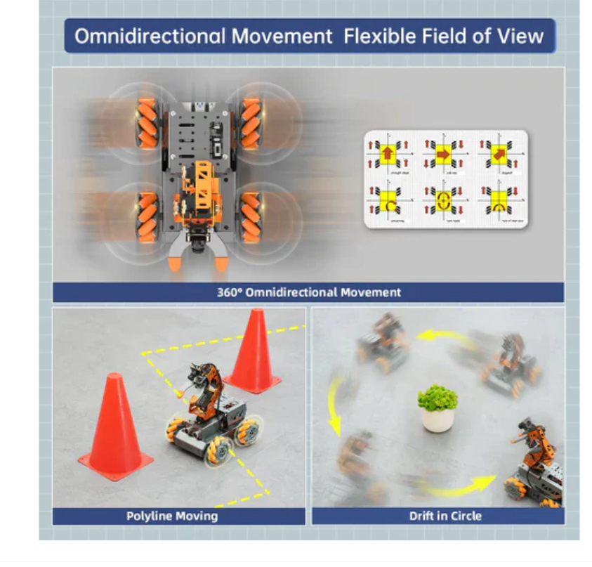 MasterPi는 360 ° 회전이 가능한 4개의 만방향 맥넘 휠을 장착하고 있으며, 다양한 모션 모드 (전진, 수평, 사행, 회전) 와 우수한 성능으로 다양한 복잡한 코스에 과감하게 도전할 수 있다.
