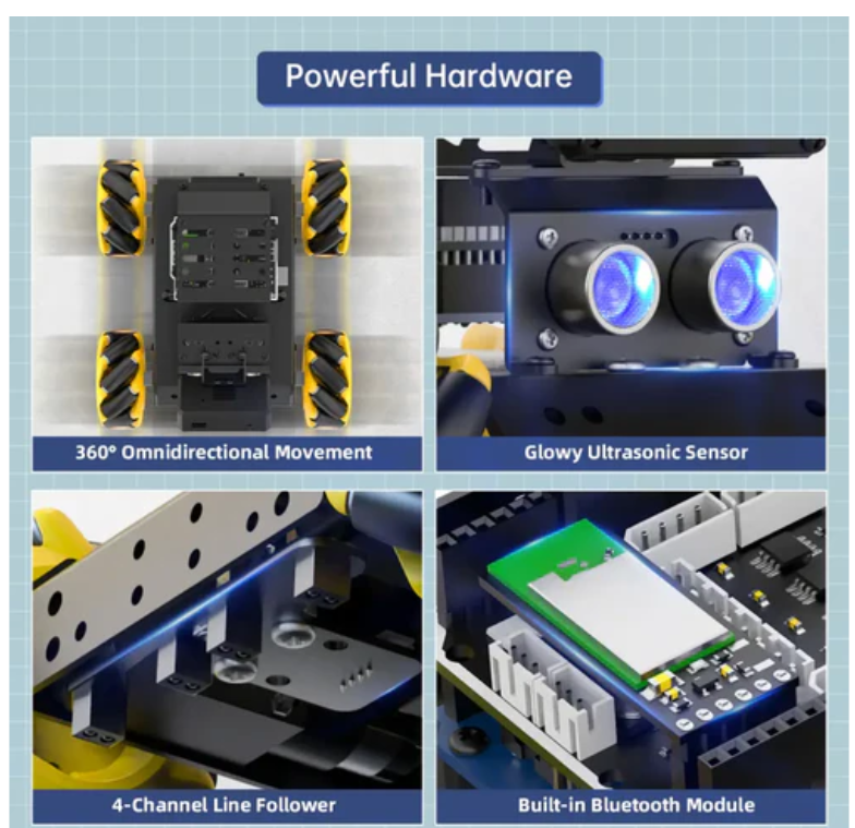 Arduino UNO R3 마스터 컨트롤러 및 확장판을 장착하여 프로그래밍 및 2차 개발을 용이하게 하는 miniAuto는 ESP32-S3 비주얼 모듈을 탑재하고 WiFi 비디오 전송을 지원하며 시각 순선, 얼굴 인식, 색상 추적 등의 응용을 실현할 수 있습니다. miniAuto는 맥넘버를 사용하여 어떤 방향으로든 이동할 수 있으며 다양한 모션 모드를 지원하여 복잡한 표면을 쉽게 탐색할 수 있습니다.4채널 순선기와 시각 모듈의 결합, 조력 miniAuto의 자동 운전 기능은 기계 클러치를 통해 확장할 수 있으며, 물체 운송, 선로 추적, 시각 안내 운송 제품 설명 miniAuto는 Hiwonder가 출시한 입문급 AI 시각 로봇 소형차로 맥넘버 설계를 사용하여 360도 전방향 운동을 실현할 수 있으며, 메인 제어는 Arduino UNO R3 및 그 프로그래밍 플랫폼과 완전히 호환된다.miniAuto는 ESP32-S3 WiFi 시각 모듈, 초음파 센서, 4 채널 순선기, Bluetooth 모듈을 포함한 고성능 하드웨어를 갖추고 있으며 여러 개의 확장 포트를 예약하고 집게 업그레이드를 지원하여 사용자가 2차 개발을 쉽게 할 수 있습니다.Arduino 호환성 miniAuto는 Arduino 환경에서 개발되었으며 소프트웨어는 Arduino IDE와 호환되며 오픈 소스 플랫폼으로서 사용자가 프로젝트를 빠르게 개발하고 디버깅 할 수 있습니다.2) APP 제어 miniAuto에는 Bluetooth 4.0 모듈이 내장되어 있으며, miniAuto의 Bluetooth에 연결하여 APP를 통해 제어할 수 있다.3) 360 ° 전방위로 360 ° 전방향 맥넘 바퀴를 이동하여 다양한 운동 모드를 실현하고 복잡한 지형과 노선에 유연하게 적응한다.4) Glowy 초음파 센서는 발광 초음파 센서를 장착하여 거리를 측정하고 컬러 빛을 통해 실시간 피드백을 제공합니다.5) 4채널 회선 추종기 miniAuto는 4개의 적외선 센서를 장착하여 회선 변화를 정확하게 감지하고 정확한 회선 추적 기능을 실현한다.6) 내장형 Bluetooth 모듈 확장 보드에는 Bluetooth 4.0 모듈과 호환되는 Bluetooth 포트가 있어 로봇을 쉽게 연결하고 제어할 수 있습니다.7) 호환 Arduino 제어 시스템 miniAuto 컨트롤러는 Arduino UNO R3 마스터 컨트롤러와 Arduino UNO R3 확장판으로 구성되어 있으며 Arduino와 완전히 호환되며 4 채널 모터 제어를 지원하고 다양한 센서 및 Bluetooth 모듈을 확장 할 수 있으며 다양한 아이디어 프로젝트를 구현하기위한 강력한 기능을 제공합니다.8) ESP32-S3 WiFi 비전 모듈 - 2.0메가픽셀 HD 카메라 - 직렬 및 IIC 통신 지원 - STA LAN 모드 지원 - AP 직접 연결 모드 지원 ① WIFI 실시간 그래픽 miniAuto는 ESP32-S3 비전 모듈을 탑재하고 듀얼 네트워크 통신 모드를 지원하며 장치 핫스팟 연결을 통해 App 또는 PC에서 특정 URL 페이지에 액세스하여 HD 이미지를 실시간으로 모니터링할 수 있습니다. ②색상 인식 miniAuto는 색상 임계값 분할 알고리즘을 사용하여 다양한 색상을 정확하게 식별하고 프로그래밍 시 다양한 피드백 동작을 수행할 수 있습니다. ③안면인식 miniAuto는 경량급 권적 신경망 알고리즘을 사용하여 시야 범위 내에서 안면인식을 하고 해당하는 사전 설정 프로그램을 시작합니다. ④색상 추적 miniAuto의 ESP32-S3 비주얼 모듈은 다양한 색상의 물체를 추적하고 사전 설정 프로그램을 실행하여 컬러 물체를 자동으로 추적합니다. ⑤유선 기반 miniAuto에는 ESP32-S3 비주얼 모듈이 탑재되어 있어 다양한 색상의 선을 인식하고 자동으로 추적하여 회선 추적 기능을 수행할 수 있다.9) Glowy 초음파 센서 기반 거리 측정 및 장애 방지 거리 측정 및 장애 방지 - miniAuto에는 거리를 측정하고 다양한 색상의 빛을 방출하는 발광 초음파 센서가 장착되어 있습니다.10) 4채널 순선기 miniAuto는 4채널 순선기를 장착하여 적외선 탐지를 이용하여 쉽게 경로를 탐색할 수 있다.시각 모듈을 조합하면 자동 운전까지 할 수 있다!11) 클립 확장, 무한한 창의성을 실현 miniAuto 고급 키트는 클립, S3 시각 모듈, 초음파 센서 및 기타 센서를 갖추고 있다.그것은 원격 조종 운송, 추적 운송, 시각 기반 운송 등을 포함한 다양한 창의적인 응용을 실현할 수 있다. ①원격 조종 운송 이 응용 프로그램을 사용하면 사용자가 miniAuto의 물체 이동 및 운송을 제어할 수 있습니다. ②선을 따라 초음파 센서를 이용하여 미니오토는 선을 따라 주행할 때 장애물을 감지하여 지정된 구역으로 운송할 수 있다. ③Visual Transport는 ESP32-S3 Visual Module을 사용하여 miniAuto가 지정된 색상의 블록을 정확하게 식별하여 자율적으로 캡처할 수 있도록 지원합니다.