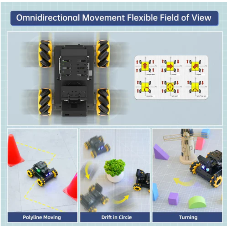 miniAuto는 Hiwonder가 출시한 입문급 AI 시각로봇 소형차로서 맥넘륜설계를 채용하여 360도 전방향운동을 실현할수 있으며 주요통제는 Arduino UNO R3와 그 프로그래밍플랫폼과 완전히 호환된다.miniAuto는 ESP32-S3 WiFi 시각 모듈, 초음파 센서, 4 채널 순선기, Bluetooth 모듈을 포함한 고성능 하드웨어를 갖추고 있으며 여러 개의 확장 포트를 예약하고 집게 업그레이드를 지원하여 사용자가 2차 개발을 쉽게 할 수 있습니다.
