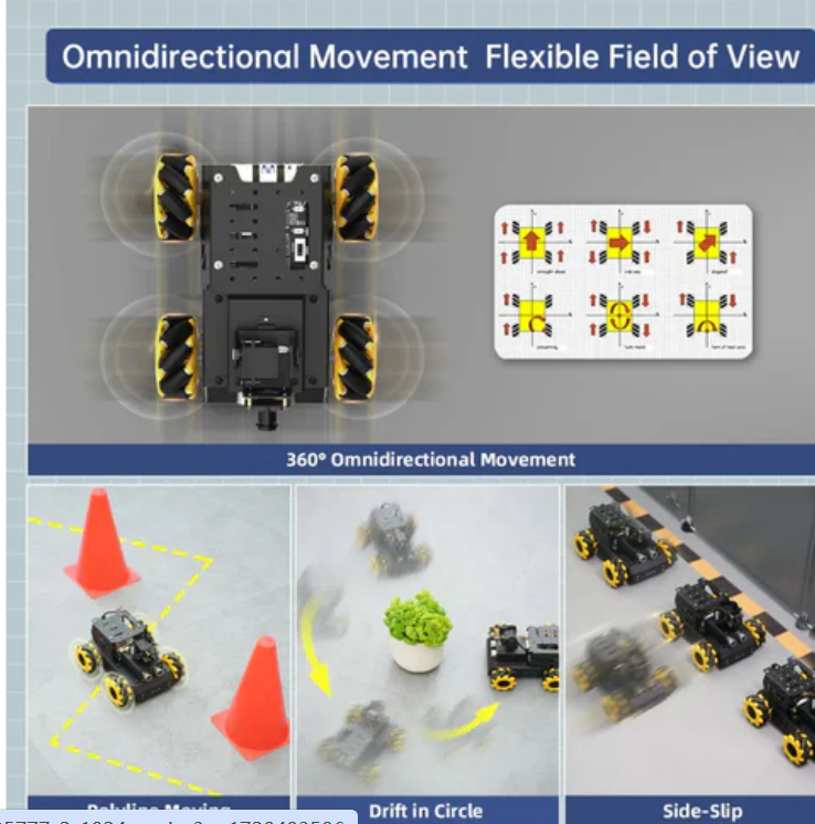 TurboPi는 360 ° 회전이 가능한 4개의 만방향 맥넘 휠을 장착하고 있으며, 다양한 모션 모드 (전진, 수평, 사행, 회전) 와 우수한 성능으로 다양한 복잡한 코스에 과감하게 도전할 수 있다.