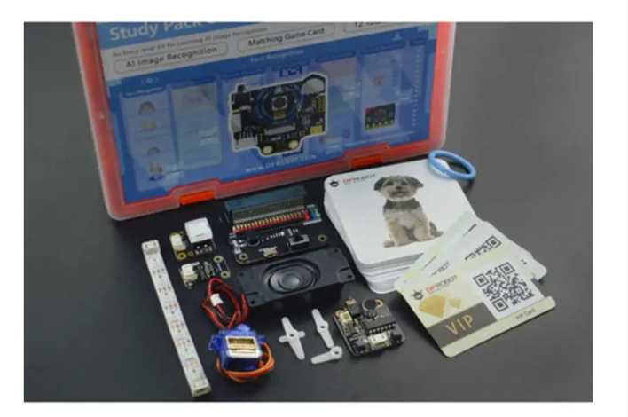 • 카드 외에도 키트에는 외부 모듈 7개가 포함되어 있습니다. 예를 들어, 서보는 얼굴 인식 잠금 해제 프로젝트에 사용할 수 있고, RGB LED 스트립은 색상 인식에 사용할 수 있으며, 음성 녹음 모듈은 사운드 관련 프로젝트에 사용할 수 있습니다.