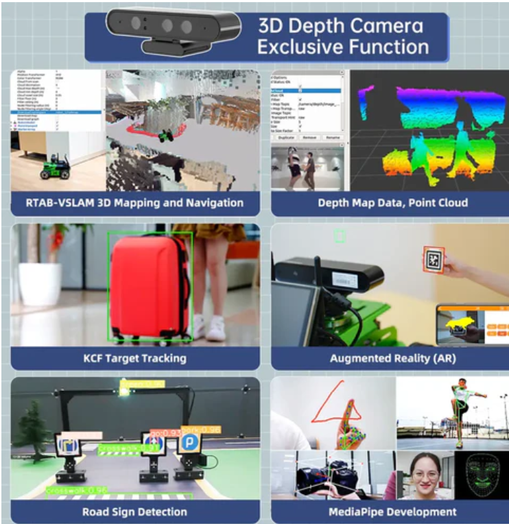 JetAcker는 3D 딥 카메라를 탑재하여 3D 비주얼 그래픽 및 네비게이션을 지원하며 3D 포인트 클라우드 이미지를 얻을 수 있으며 딥 러닝을 통해 더 많은 AI 비주얼 인터렉션 플레이를 구현할 수 있습니다.