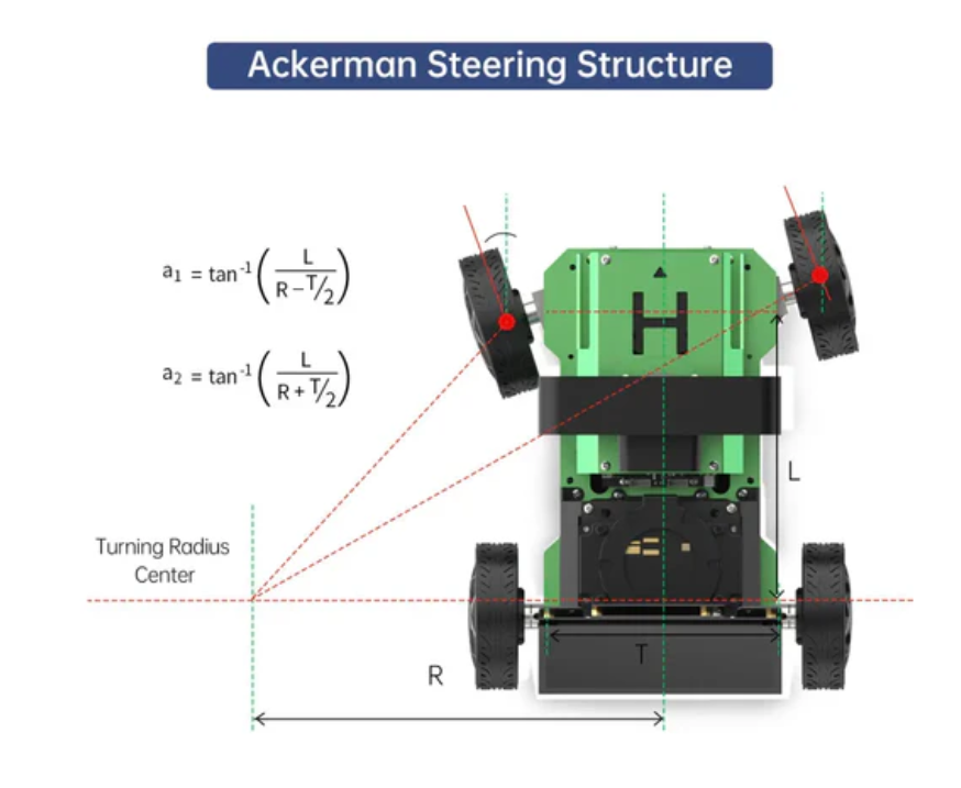 섀시의 뒷바퀴는 시종 평행상태에 처해있으며 회전할 때 내측차바퀴의 회전각도가 외측차바퀴의 회전각도보다 크며 내, 외측차바퀴의 회전각도의 차이를 리용하여 회전하는데 이를 아크만회전이라고 한다.