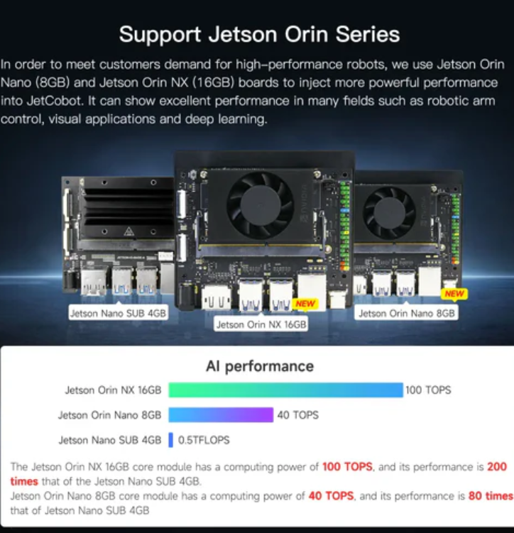 NVIDIA 시리즈 개발판을 주 제어로 하는 JetCobot은 복잡한 시각 및 제어 알고리즘을 효율적으로 처리하고 실시간 응답과 효율적인 실행을 보장하는 강력한 계산력과 AI 처리 능력을 가지고 있습니다.