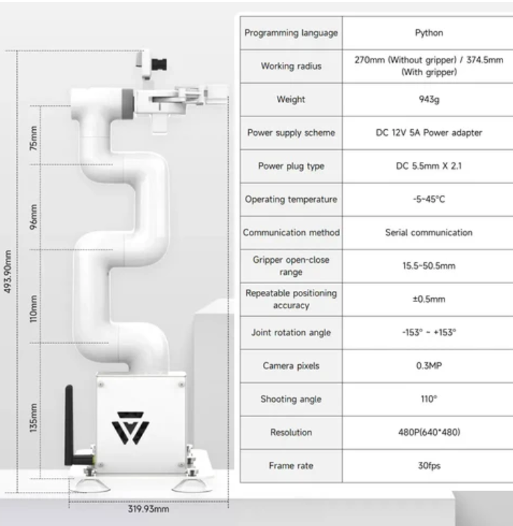 JetCobot은 7축 설계로 UR 로봇과 비슷한 구성을 갖추고 있으며 역운동학 알고리즘과 함께 유연하고 정확한 모션 제어를 보장한다.최대 유효 팔 전개 270MM, 관절 회전 범위 -153 ° ~153 ° 로 여러 가지 복잡한 조작 임무에 대처할 수 있다.