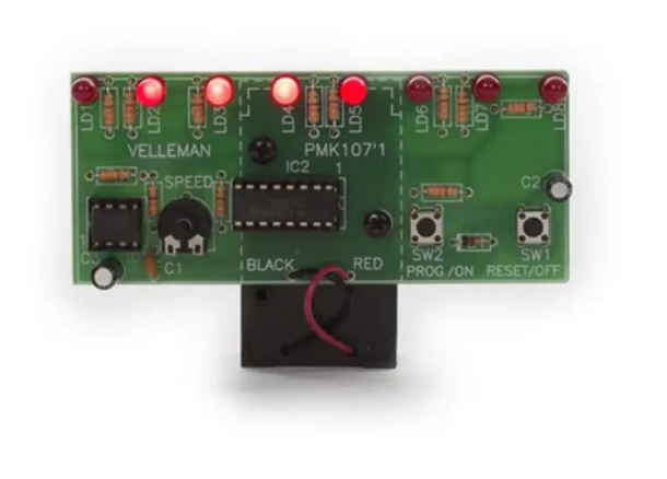 LED 주행등 납땜 키트에는 LED 8개가 포함되어 있습니다. PROG 버튼을 눌러 LED 동작 효과를 조정할 수 있습니다. 실행 효과의 속도를 조절하는 SPEED 전위차계와 전원 대기 버튼(OFF 버튼)이 있습니다.