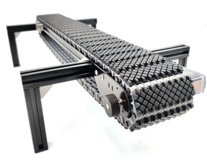 수송기의 프레임은 알루미늄 압출 부품과 복합 G10 패널로 만들어졌다.마찰 상단 (고무 패턴) 모듈식 트랙 세그먼트는 제품이 컨베이어에 유지되도록 보장하는 데 도움이 되며 구동 및 타륜 체인 바퀴는 항상 궤도를 정렬합니다.