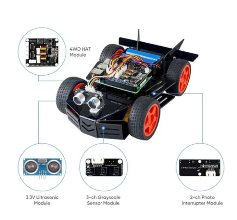 Raspberry Pi 자동차 로봇 키트는 초보자와 전문가를 위해 Android 및 iOS 휴대폰 제어에 의해 다양한 기능을 제공하도록 설계된 모듈을 Raspberry Pi 4B 및 3 Model B+/3B(포함하지 않음)에 적용하여 다양한 기능을 지원합니다: 장애물 회피, 흔적 등 Raspberry Pi 자동차 로봇 키트(RPi 제외)는 초보자와 전문가가 전자 제품을 학습하기에 적합합니다.Raspberry Pi 4B 및 3 Model B+/ 3B에 적용됩니다.그레이스케일 모듈, 초음파 모듈, 빛 차단 센서 모듈을 통해 승용차는 장애물 회피, 순선, 물건 따라가기, 절벽 검측, 속도 측정, 거리 계산 등의 기능을 실현할 수 있다.Raspberry Pi 자동차 로봇 키트 호환 Pi 4B/3B+/3B - 클릭 확대 또한, 이 새로운 Raspberry Pi 스마트 승용차는 튜토리얼을 포함하여 키트를 쉽게 조립할 수 있습니다.또한 이러한 기능을 빠르게 켜거나 끄고 자유롭게 조합할 수 있는 친숙한 브라우저 소프트웨어를 갖추고 있습니다.전자, 프로그래밍을 배우는 멋진 소형 자동차 키트를 보실 수 있습니다