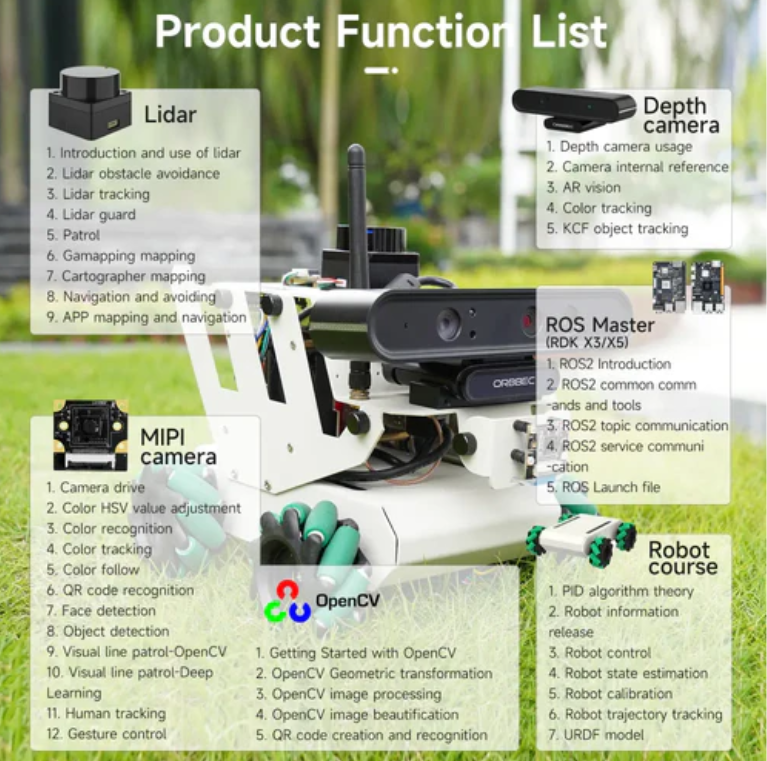 RDK X5 개발판은 ROS2 운영체제를 탑재해 이 AI 비주얼 승용차에 탁월한 기능과 기동성을 부여했다.RDK 로봇 소형차는 맥넘 휠 디자인으로 다양한 환경에서 유연하고 자유롭게 이동할 수 있다.심층 카메라와 레이저 레이더의 결합으로 목표물을 정확하게 식별하고 추적할 수 있으며 스마트 항법과 장애물 회피 기능을 실현할 수 있다.Jupyter Lab Python 프로그래밍과 딥 러닝 알고리즘을 통해 승용차는 실시간으로 주변 경치를 식별, 분류 및 분석할 수 있어 더 높은 수준의 스마트 의사결정과 인터렉션을 실현할 수 있다.