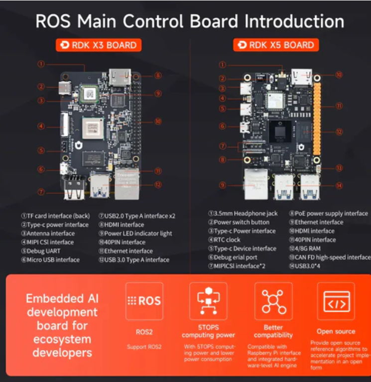새로운 RDK X5 개발 보드를 사용하여 실시간 데이터와 복잡한 컴퓨팅 작업을 처리할 수 있는 충분한 컴퓨팅 리소스를 보유하고 있으며 파이썬 프로그래밍과 ROS2 운영 체제를 결합하여 다양한 스마트 알고리즘을 개발할 수 있습니다.