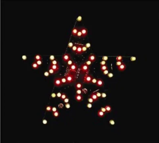 사운드 스타 납땜 키트에는 사운드 스타를 위한 LED 60개가 포함되어 있습니다. 파티, 이벤트, 전시회 등에 적합합니다. 마이크가 내장되어 있습니다. VU 미터 시스템을 사용하여 음성과 음악에 반응합니다. 별 모양의 볼륨 미터가 당신의 파티를 밝게 만들어 줄 거예요.