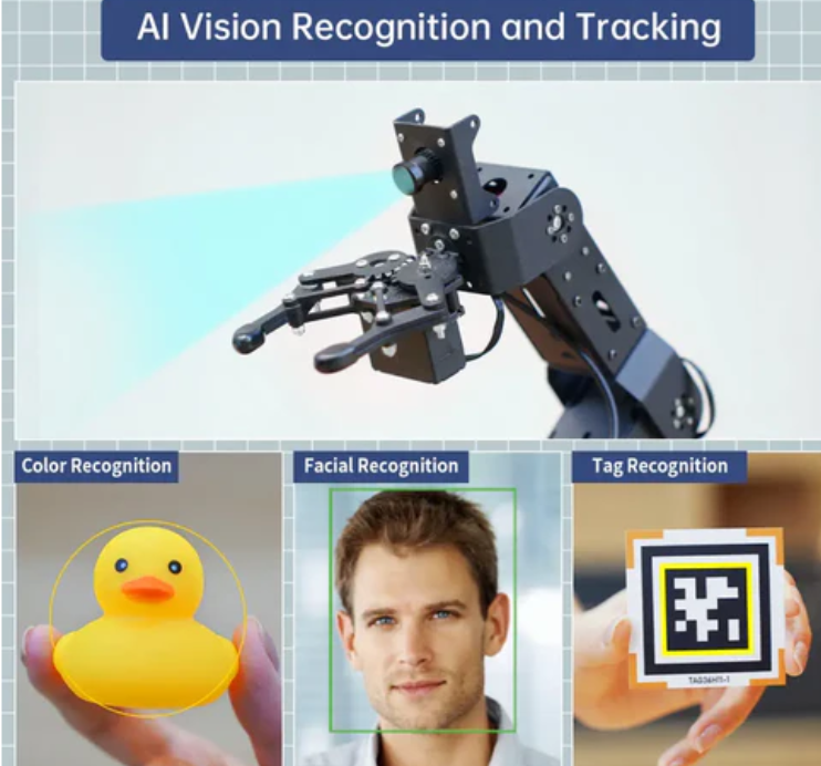 5DOF 인공 지능형 시각 로봇 팔을 장착하여 대상 물체의 정확한 위치, 추적, 픽업, 분류 및 스태킹을 실현합니다.