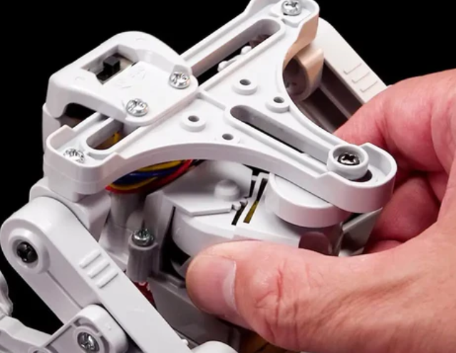 이 로봇은 연회색 플라스틱 부품으로 구성됐다.다리 부분과 플라스틱 레일은 구멍으로 설계되어 있으며 자공 나사를 사용하여 만방향 축, 팔 및 기타 원본 부품과 같은 다른 부품을 연결할 수 있습니다.이것은 로봇의 모양을 사용자 정의할 수 있습니다.로봇의 조립은 매우 간단하며 버클 / 나사 연결 설계를 사용합니다.조립 난이도 등급은 5점 중 3점으로 조립 예상 시간은 120∼180분이다.