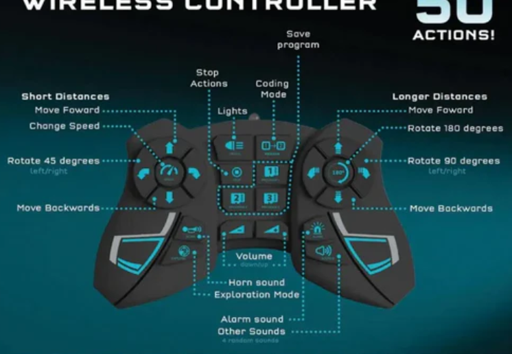 특수 Code+Control 무선 장치를 사용하면 Robo Dozr를 실시간으로 직접 제어하거나 버튼을 누르기만 하면 로봇이 실행할 수 있는 명령 시퀀스를 작성하고 저장할 수 있습니다.애플리케이션이나 개별 디바이스가 필요하지 않습니다.Robo Dozr는 LED 램프, 스피커, 두 개의 전기 모터, 유연한 무한궤도, 트럭 객차, 두꺼운 삽을 갖추고 있어 동력이 충분하고 언제든지 행동할 준비가 되어 있다.
