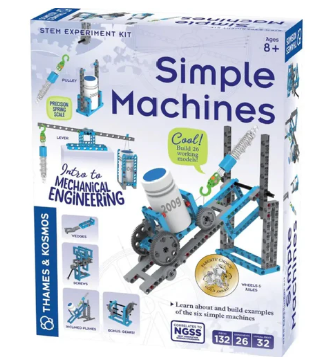 Thames & Kosmos 단순 기계 STEM 실험에는 바퀴 및 축, 레버, 풀리, 경사, 나사 및 쐐기 - 및 기어 등 6가지 고전적인 단순 기계 모두 연구하는 26개의 모델 구축 연습이 포함되어 있습니다.