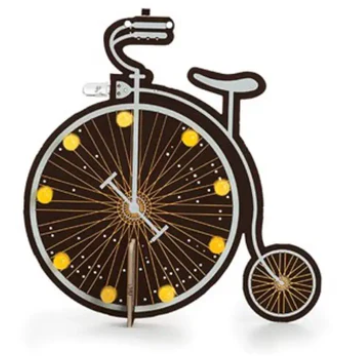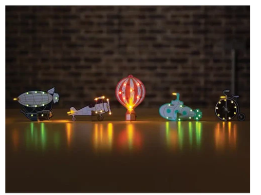 두 번째 키트는 위쪽의 작은 장착 구멍을 이용해 걸거나 그 자체로 세울 수 있는 쥘 베른 스타일의 자전거 스타일을 특징으로 합니다. 이 제품은 여러 개의 노란색 LED 조명과 그 위에 깜빡이는 따뜻한 촛불 모양의 LED 조명이 달린 독특한 갈색 프린트가 특징입니다.