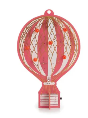 첫 번째 키트는 쥘 베른의 열기구 모양으로 디자인되었으며, 상단의 작은 장착 구멍을 이용해 매달거나 그 자체로 세울 수도 있습니다. 이 제품은 여러 개의 주황색 LED 조명과 중앙에 깜빡이는 따뜻한 촛불 모양의 LED 조명이 있는 독특한 주황색-빨간색 인쇄물이 특징입니다.