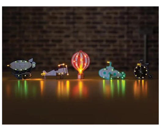 • 이 특정 키트는 쥘 베른 스타일의 비행선 모양이며, 상단의 작은 장착 구멍을 통해 매달거나 그 자체로 세울 수 있습니다.