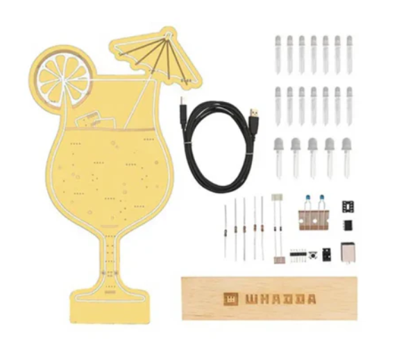 Whadda Summer Cocktail XL 납땜 키트(WSXL105)는 특수 확산 효과가 있는 장식용 RGB LED를 탑재하고 있습니다. 납땜이 완료되면 LED가 5가지의 다양한 조명 효과를 제공합니다. 내장된 ATtiny 칩에는 몇 가지 기본 LED 효과가 미리 프로그래밍되어 있으므로 제공된 어댑터로 전원을 공급하기만 하면 키트가 작동합니다.